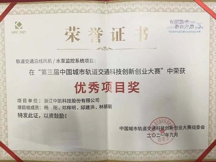 經(jīng)過初賽、復(fù)賽、答辯等環(huán)節(jié),中凱科技的軌道交通沿線風(fēng)機(jī)/水泵監(jiān)控系統(tǒng)獲得了項目評審方的肯定,從幾百個參賽項目中脫穎而出,榮獲優(yōu)秀參賽獎。